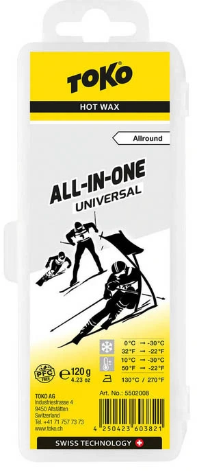 Toko All-in-one Universal 120 g - univerzální lyžařský vosk pro všechny sněhové podmínky. Hodí se na běžky i sjezdovky. Má za úkol zlepšit skluzové vlastnosti a chránit skluznici před agresivním technickým sněhem.