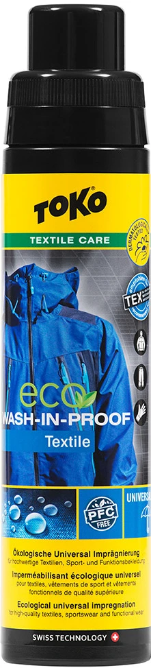 Toko Eco Wash-in-Proof 250 ml – biologicky odbouratelná impregnace pro membránové oblečení (membránové bundy, nepromokavé kalhoty...). Je určené membránové oblečení z Gore-texu, Blocventu, Dermizaxu a dalších membránových materiálů. Zlepší nenasákavost látek nalaminovaných na membrány.