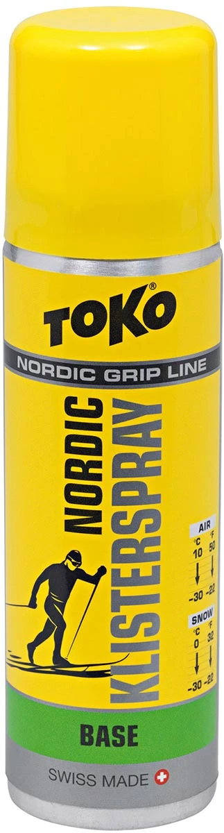 Toko Nordic Klister Spray Green 70 ml - základní tekutý klistr pro teploty sněhu 0 °C — -30 °C . Je určený pro ledovatý nebo hrubozrný sníh, firn. Dává vám vysokou přilnavost. Dá se použít jako základní vrstva pro další klistry, zlepšuje odolnost vrstev proti otěru.