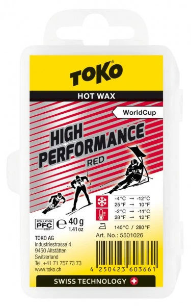 Vosk Toko High Performance red 40 g –4°/-10°C je oproti vosku Toko Performance rychlejší a hodí se pro závodní lyžování a zejména na tréninky.