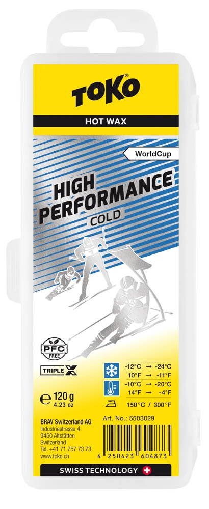 Skluzový vosk na lyže Toko World Cup High Performance TripleX Cold -12°/-24°C 120 g - závodní skluzový vosk, který se hodí pro teploty –12 až –24°C je určen pro nejchladnější sníh nebo na hrubý, umělý sníh. Tento vosk se také hodí jako podkladový vosk.