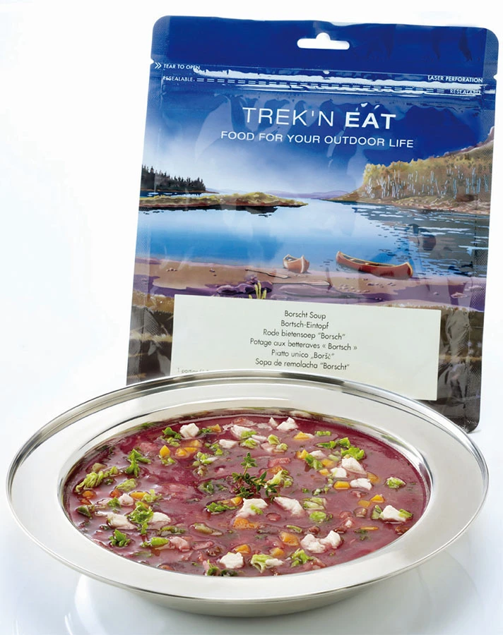 Trek’N Eat Bohatýrský boršč: je dehydrovaná expediční strava určená do míst, kde musíte vše nosit na zádech. Pak oceníte nízkou váhu v sušeném stavu. Tento oblíbený ruský masový pokrm pro nasycení i zahřátí, který může sloužit jako vydatná polévka pro dva či hlavní chod pro jednoho. Příprava pouhým přidáním horké vody (550 ml) do originálního sáčku.