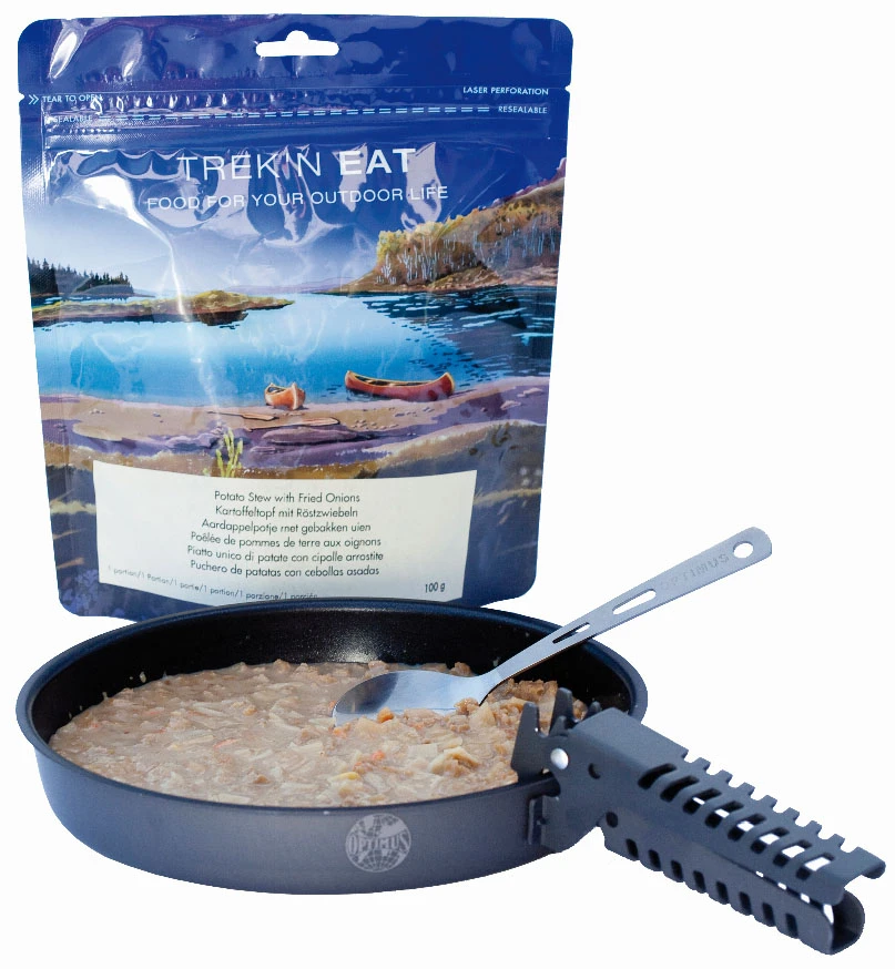 Trek’N Eat Bramborová pánev se zlatavou cibulkou: je dehydrované jídlo na cesty. Příprava pouhým přidáním vroucí vody (490 ml) do originálního sáčku, z něhož je pak pokrm přímo konzumován.