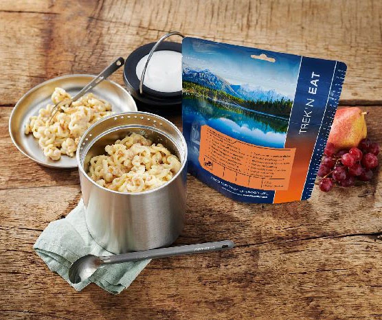 Trek’N Eat Sýrové nudle s osmaženou cibulkou 240 g: je strava pro cestování nalehko, kdy máte vymražené jídlo v pytlíku, je lehké a má malý objem, ale má dobrou chuť. Stačí přilít do pytlíku teplá voda a je možné jíst.