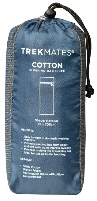 TrekMates Cotton: bavlněná vložka do spacáku obdélníkového tvaru s kapsou na polštář. Vložka plní hned několik funkcí, slouží jako zateplení do spacího pytle, chrání spacák uvnitř před zašpiněním, nebo jako samostatný hygienický pytel při spaní na chatách. Malé a lehké balení vhodné na kempování i na turistiku.