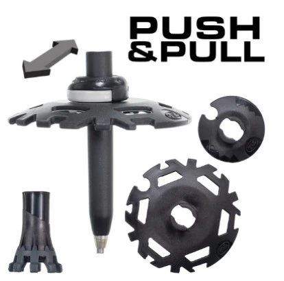 Uchycení talířků systémem Push & Pull, talířek lze snadno a rychle připnout i odepnout, můžete tak efektivně využít jakýkoliv terén.