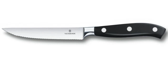 Victorinox Grand Maitre 12 cm nůž steakový, vlnkované ostří: je určený pro porcování steaků. Délka čepele je 12 cm. Čepel je kovaná z jednoho kusu oceli pro lepší vlastnosti a vysokou pevnost. Ergonomicky tvarovaná rukojeť je plastová, tedy hygienická, ale zároveň se dobře drží za každých okolností.
