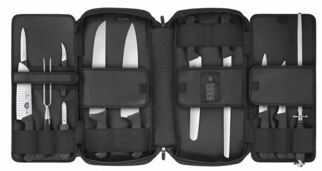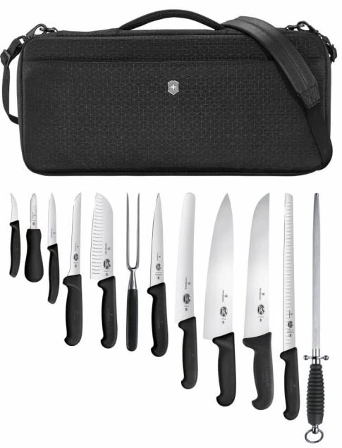 Victorinox Kuchařská sada v pořadači Chef’s 12 ks: je kompletní sada kuchyňských nožů do kuchyně, která potěší každého kuchaře. Je určená primárně pro profesionály, kteří mají vlastní nože, které si sami udržují ostré a nepoužívají tkz. erární nože, které jsou často v zoufalém stavu a špatně se s nimi pracuje.