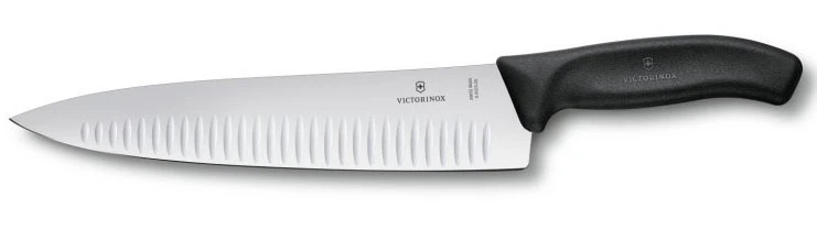 Victorinox Kuchařský nůž Swiss Classic 25 cm: je univerzální kuchyňský nůž, který je určený pro všestrannou práci v kuchyni. Můžete ho použít na maso, cibuli i zeleninu. Délka čepele je 25 cm. Duté výbrusy na široké čepeli brání nežádoucímu lepení krájené suroviny k noži. Nůž je dobře vyvážený.