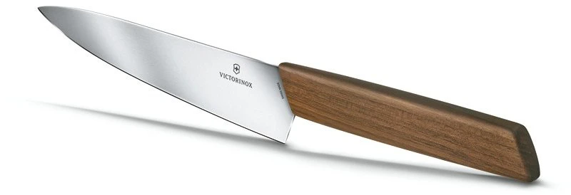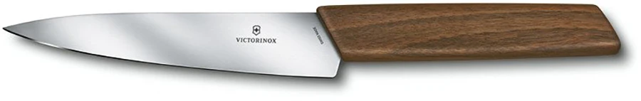 Victorinox Kuchařský nůž Swiss Modern 15 cm: kuchyňský nůž s čepelí 15 cm a dřevěnou rukojetí z vlašského ořechu, který vyniká svou tvrdostí. Ostrá čepel z nerezavé oceli zajistí snadné krájení masa i zeleniny. Nůž je oblíbený jak v domácnosti tak i u profesionálů.
