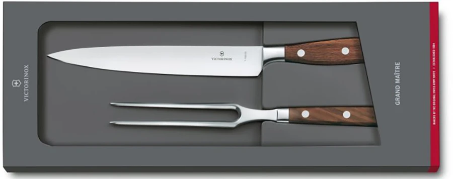 Victorinox Sada na porcování Grand Maître Wood 2 ks: sada nože a vidličky na porcování masa, oba kousky jsou kované z jednoho kusu oceli, mají kvalitní rukojeť z javorového dřeva. Čepel nože je dlouhá 20 cm, vidlička má ostré dostatečně dlouhé hroty aby jste mohli maso bezpečně přidržet při porcování, hodí se i na otáčení či vyndání masa z pekáče. Špičkové zpracování a výborné materiály, tak jak jste roky u firmy Victorinox navyknutí.