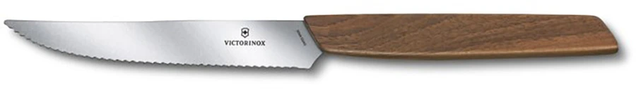 Victorinox Sada steakových nožů Swiss Modern: sada dvou steakových nožů s vroubkovaným ostřím pro krájení i těch nejmenších kousků masa. Délka čepele je 12 cm a je vyrobená z kvalitní nerezové oceli odolné proti opotřebení.
