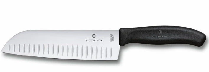 Victorinox Santoku Swiss Classic 17 cm s výbrusy: je univerzální kuchyňský nůž v populárním santoku tvaru, který vychází z tradičních japonských nože, ale má upravenou rukojeť do evropského stylu.