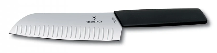 Victorinox Santoku Swiss Modern 17 cm s výbrusy: je univerzální kuchyňský nůž v populárním santoku tvaru, který vychází z tradičních japonských nože, ale má upravenou rukojeť do evropského stylu.