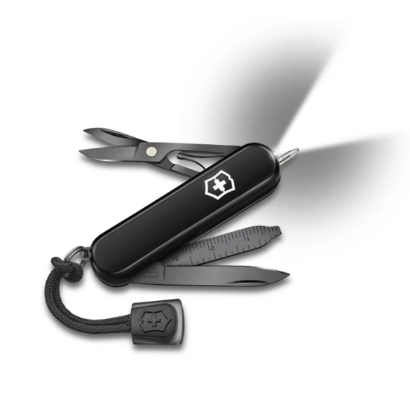 Victorinox Signature Lite Onyx Black: Praktický skládací nožík, vhodný do každé kabelky, nebo kapsy. Nabízí spoustu klasických funkcí, ale také tu najdete LED diodu na svícení, a tlakové kuličkové pero pro zapisování či označování. Délka nože je 58 mm. Před používáním kuličkového pera se doporučuje otevřít pilník.