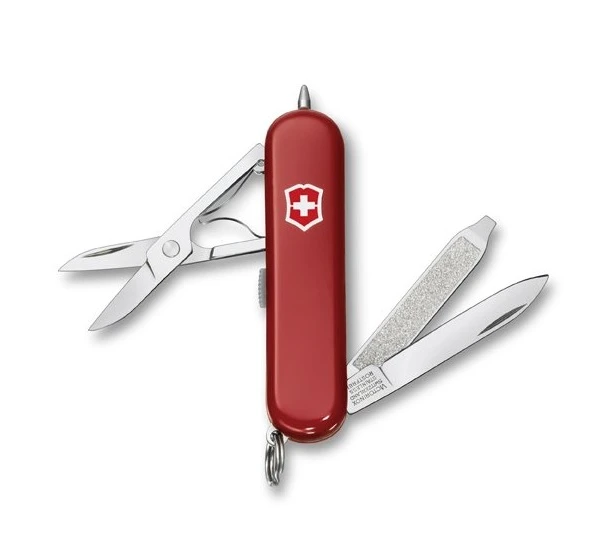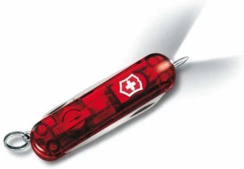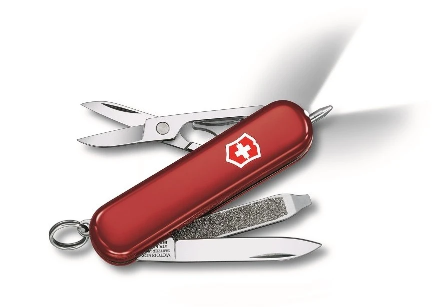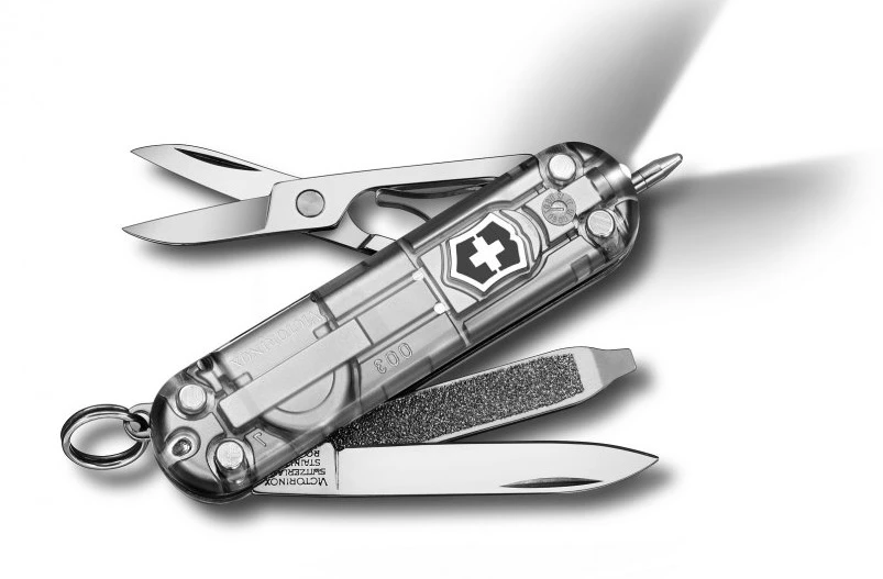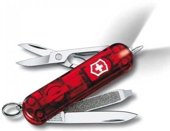 Victorinox Signature Lite: Praktický skládací nožík, vhodný do každé kabelky, nebo kapsy. Nabízí spoustu klasických funkcí, ale také tu najdete LED diodu na svícení, a tlakové kuličkové pero pro zapisování či označování. Délka nože je 58 mm. Před používáním kuličkového pera se doporučuje otevřít pilník.