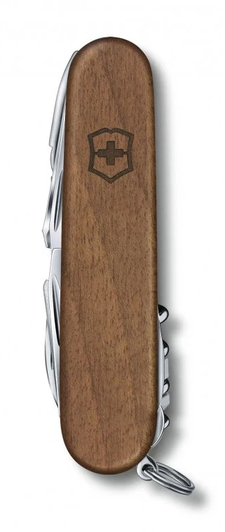 Victorinox Swiss Champ Wood: multifunkční nůž s 29 funkčními nástroji. Délka nože je 91 mm. Čepel je vyrobena z kvalitní nerezové oceli Dauphinox. Střenka je vyrobena ze dřeva vlašského ořechu, každý nůž je tak originál.