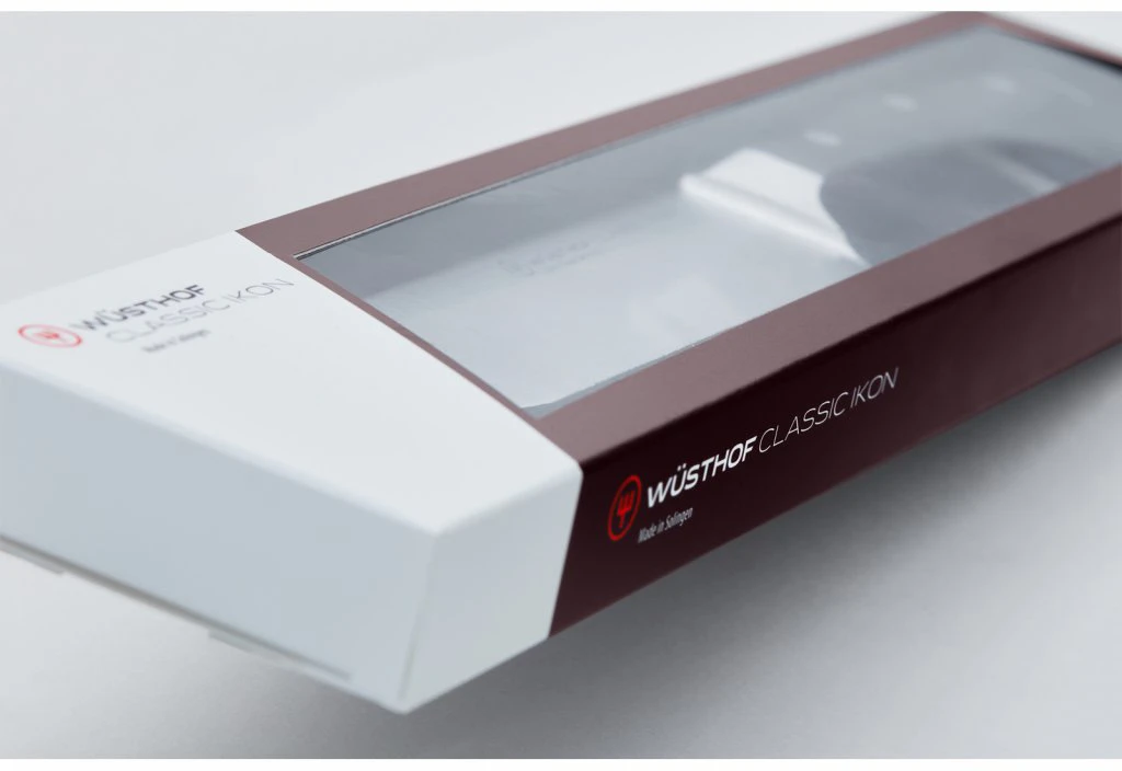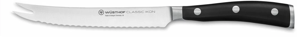 Wusthof Classic Ikon Nůž na rajčata 14 cm: nůž na rajčata s vidlicovou špičkou vhodnou na servírování. Nůž má vlnkované ostří které nakrájí rajčata na velmi tenké plátky.