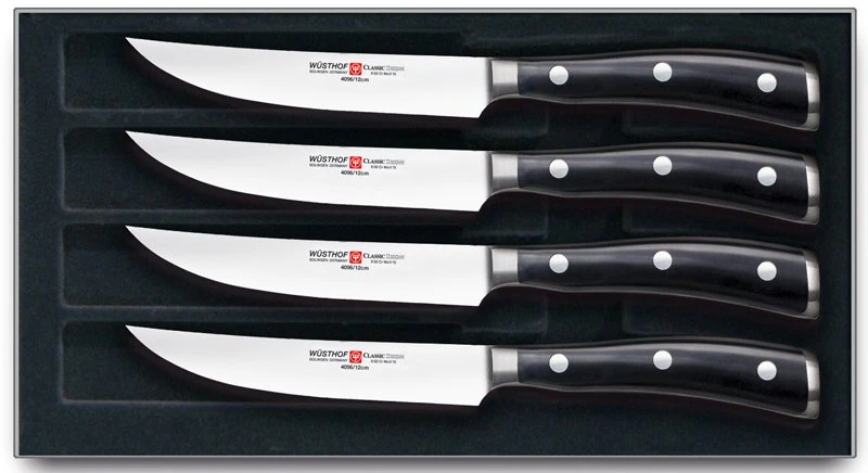 Wusthof Classic Ikon Nůž na steak 12 cm 4 ks: je elegantní steakový nůž, který se hodí pro krájení steaku (na prkénku). Délka čepele je 12 cm.