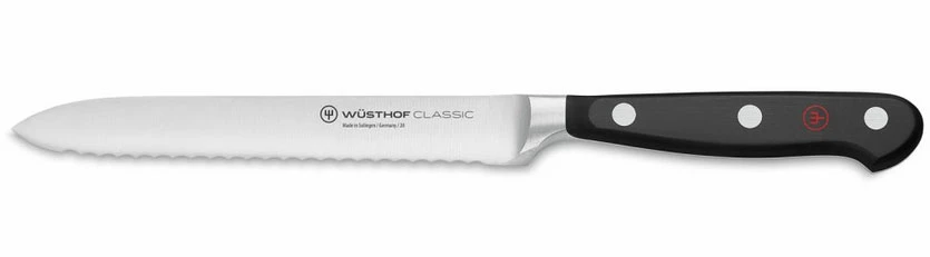 Wusthof Classic Nůž na uzeniny 14 cm : je menší nůž se zoubkovanou čepelí, který se hodí pro krájení uzeniny, ale i baget, bulek nebo chleba.