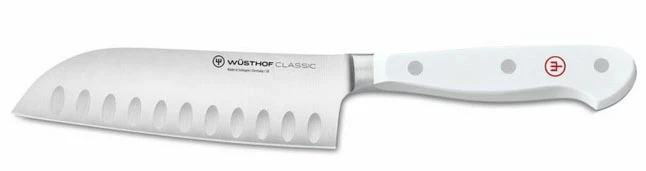 Wusthof Classic White Santoku 14 cm : je menší, univerzální nůž v japonském tvaru se plastovými, elegantní střenkami. Hodí se jako univerzální nůž pro kuchaře, který ho využije na krájení masa, ryb, zeleniny, cibule.... V japonské kultuře zastává funkci šéfkuchařského nože.
