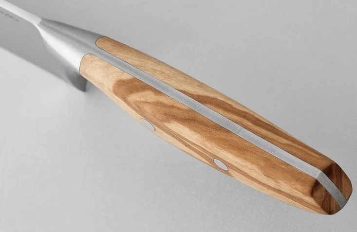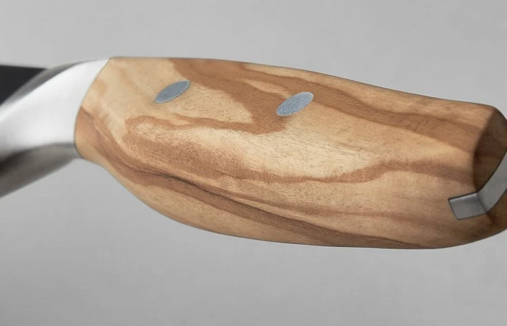 Ergonomická rukojeť je z olivového dřeva, dobře se drží, je příjemná na dotek, má pěknou kresbu. Střenky rukojeti jsou trvanlivě spojeny dvěma nýty z nerezové oceli.