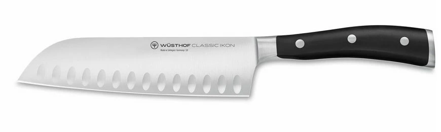 Wusthof Santoku Classic Ikon 17 cm : je nůž japonského tvaru určený pro krájení zeleniny, ovoce, masa nebo ryb. Hodí se pro přípravu asijského jídla, kde je hodně zeleniny a materiál se často krájí na tenké nudličky nebo proužky. Santoku znamená v překladu tři dobroty, je tedy určený maso, zeleninu, ovoce.