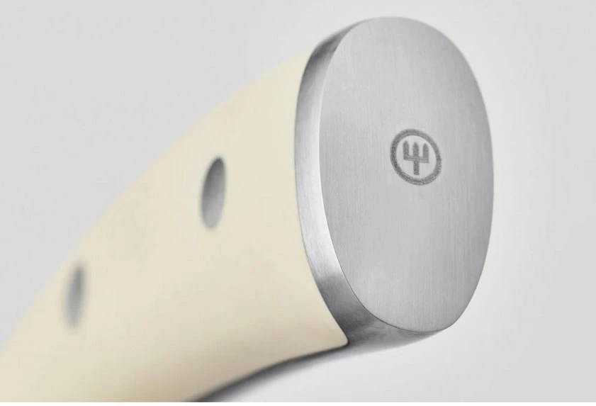 Tvarovaná rukojeť je z odolného a na pohled velmi pěkného materiálu v krémovém designu, dobře se drží, je příjemná, ale hlavně bezúdržbová, nevadí ji voda, je vysoce odolná. Střenky rukojeti jsou trvanlivě spojeny třemi nýty z nerezové oceli.