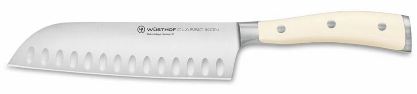 Wusthof Santoku Classic Ikon Créme 17 cm : je středně velký, ideální nůž v japonském tvaru se plastovými, elegantní střenkami v barvě slonové kosti. Hodí se jako univerzální nůž pro kuchaře, který ho využije na krájení masa, ryb, zeleniny, cibule.... V japonské kultuře zastává funkci šéfkuchařského nože.