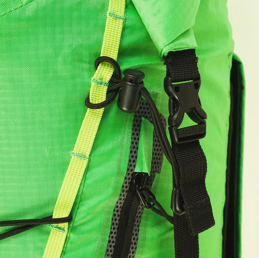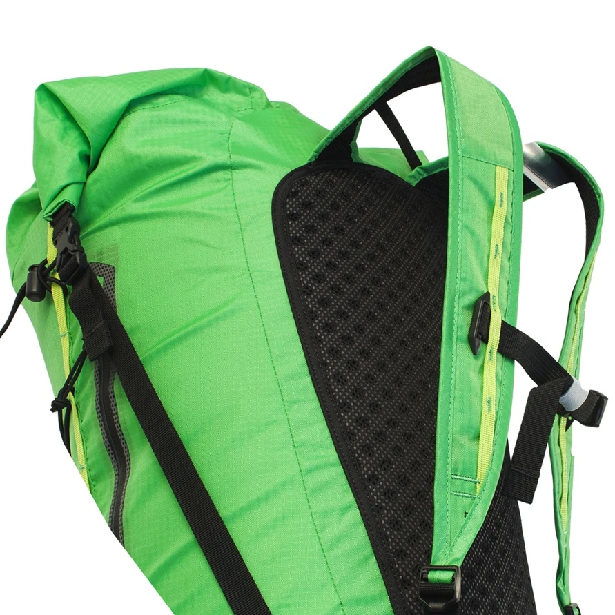 Batoh je vyrobený z pevného, ale měkkého materiálu, takže ho využijete jako odolný batoh na výlety, nebo ho jednoduše sbalíte a použijete jako náhradní zavazadlo. Díky rolovacímu uzávěru (stejný systém zavírání, jako je u nepromokavých vaků) lze měnit objem batohu a díky tomu je vhodný také jako kabinové zavazadlo do letadla. Můžete si být jistí že se vám v dešti, nebo v krátkodobé pobytu ve vodě, nedostane do batohu žádná vlhkost ani voda.