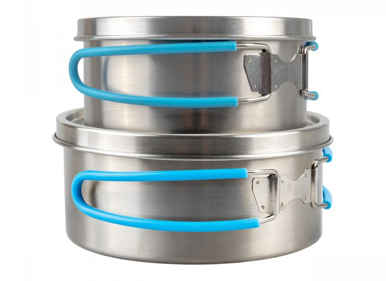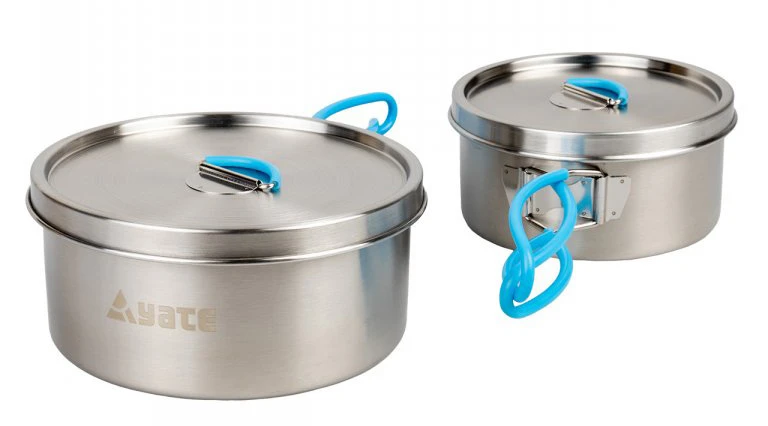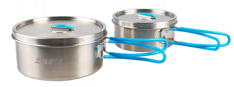Yate Adventure: sada na vaření pro 2-3 osoby, hrnce jsou z kvalitní nerezové oceli. Sklopná držadla a pokličky jsou opatřeny silikonem.