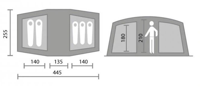 Yate Family: dvouplášťový stan se dvěma ložnicemi a velkou předsíní s výškou 210 cm. Stan je vhodný pro 4 - 5 osob, kdy v jedné ložnici mohou spát až 3 děti a ve druhé rodiče. Podlážka i v předsíní, stan má vynikající větrání.