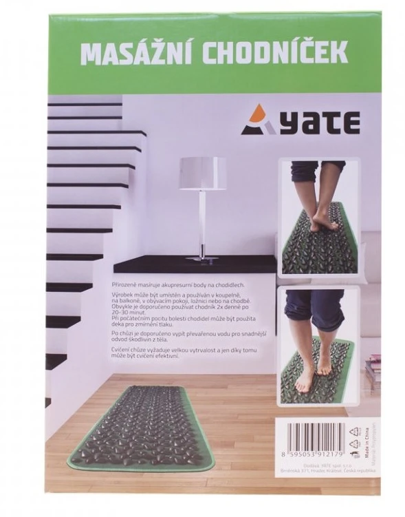 Yate Masážní chodníček: Masážní chodníček nahrazuje chůzi naboso. Díky umělým kamínkům, které jsou vyrobeny z plastu, stimuluje reflexní body na chodidlech. Je vhodný na používání doma, pro lidi trpícími bolestí páteře, a problémem plochých nohou, nebo se sedavým zaměstnáním. Podložka díky kamínkům podporuje správnou cirkulaci krve, stimuluje chodidla, posiluje unavené svalstvo a dodává tělu energii. Na masážním koberci můžete ležet, procházet se, nebo si masírovat nohy v sedě.