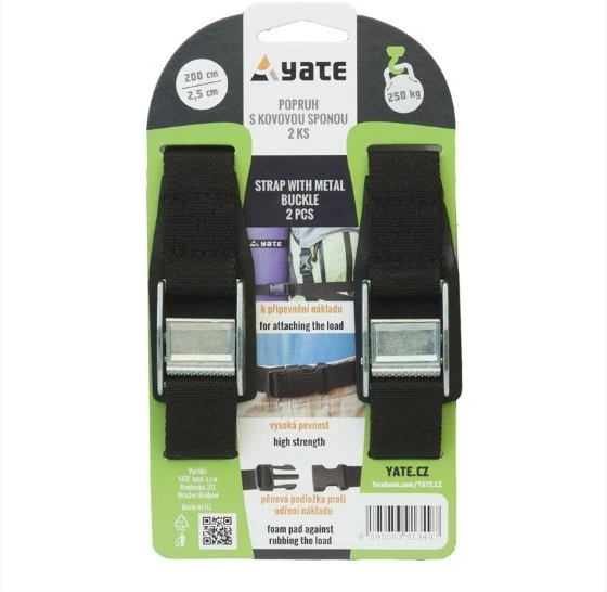 Yate popruh s kovovou sponou: Popruhy jsou vhodné pro upevnění těžkých nákladů. Nosnost popruhů je až 250kg. Popruhy u vás najdou velmi široké uplatnění, jako například při upevňování nákladu na zahrádku auta nebo k přívěsu, upevnění lyží, kol nebo kajaků. Kovová spona je na spodní straně potažena pěnovou podložkou, aby nepoškodila náklad nebo lak karoserie auta. Můžete si vybrat ze dvou délek popruhu. K dostání v sadě po 2ks.