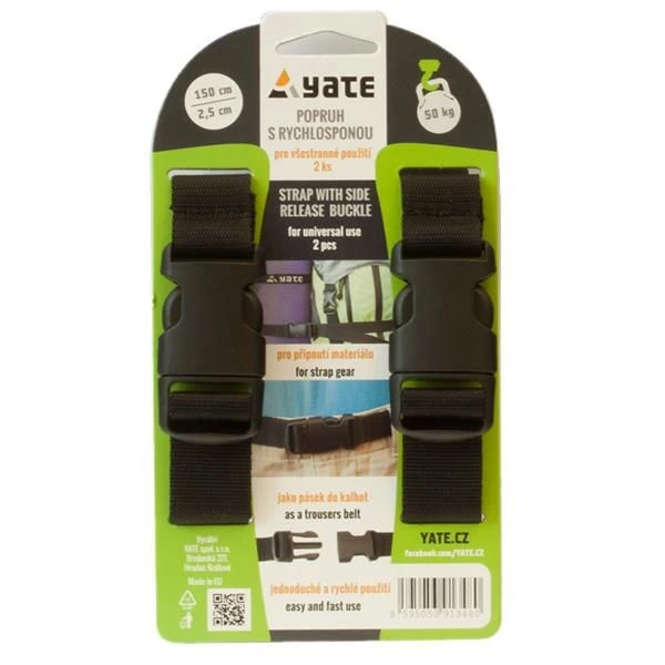Yate popruh s rychlosponou: Popruhy jsou vhodné na upevnění nákladu, nebo zavazadel. Lze je využít i jako náhradní pásek ke kalhotům, nebo taškám. Jednoduchou manipulaci vám zajistí plastová rychlospona (trojzubec), díky které vše rychle zajistíte i odepnete. Dodáváno v sadě po 2 ks.