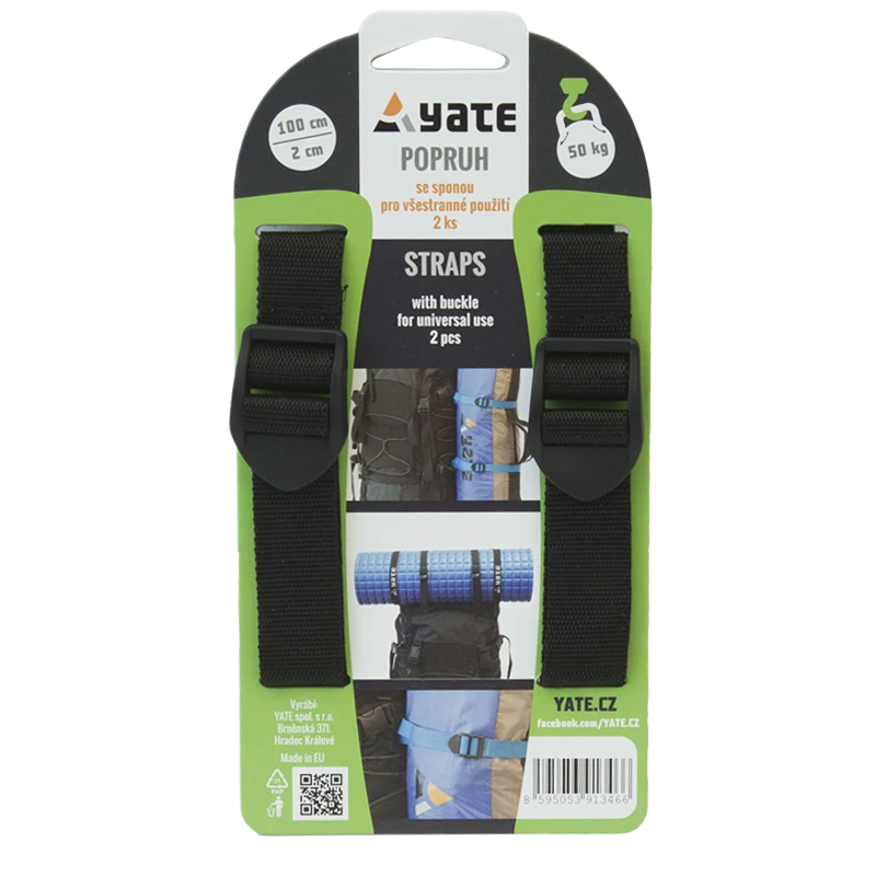 Yate popruh se sponou: Popruhy jsou vyrobeny z pevného nylonového materiálu. Jednoduše se upevní pomocí plastové spony. Najdou u vás široké uplatnění. Využijete je k připevnění břemen k batohu, na zahrádku auta, ke kolu atd.