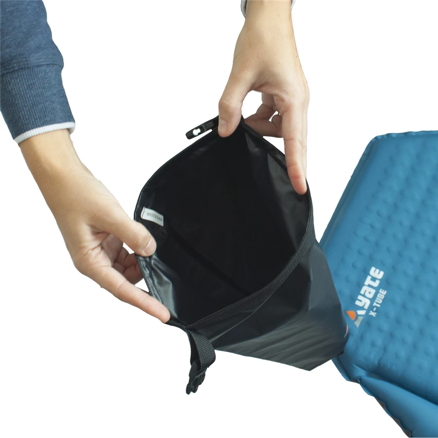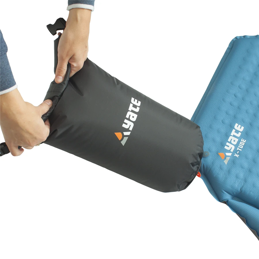Yate Vodotěsný obal / pumpa: Tento obal ochrání spolehlivě vaši karimatku před vlhkostí a špínou. Zároveň vám také poslouží jako pumpa pro nafouknutí samonafukovacích karimatek nebo buřtovek, díky otvoru s ventilem, který se nachází na dně obalu. Toto použití je vhodné zejména v chladném prostředí, kde je potřeba vhánět do karimatky pouze suchý vzduch, a není tedy vhodné karimatku dofukovat ústy (vlhký vzduch z plic). Prodloužíte tak životnost svojí karimatky a zlepšíte její izolační schopnosti.